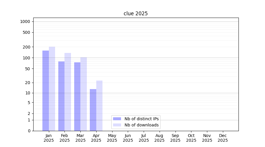 Number of downloads for experiment package clue, year by year, from 2025 back to 2014 (years with no downloads are omitted):