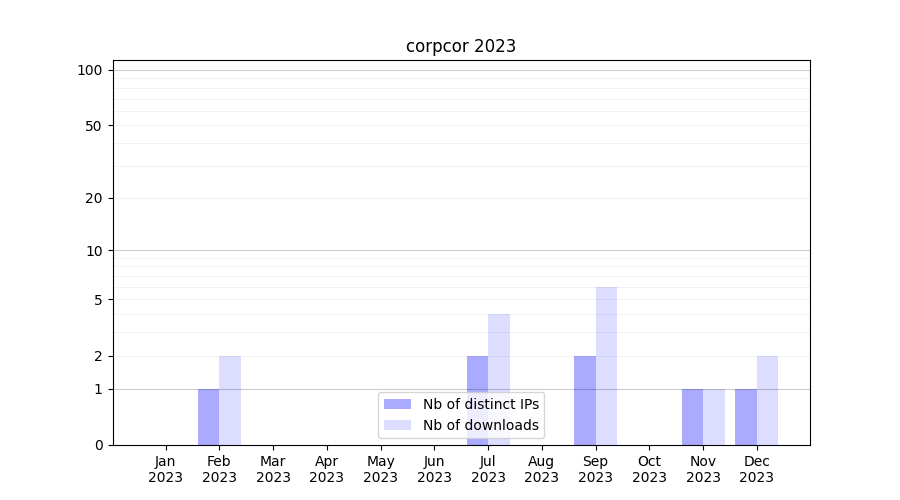 Number of downloads for experiment package corpcor, year by year, from 2025 back to 2014 (years with no downloads are omitted):