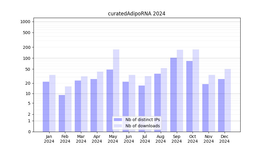 Number of downloads for experiment package curatedAdipoRNA, year by year, from 2025 back to 2014 (years with no downloads are omitted):