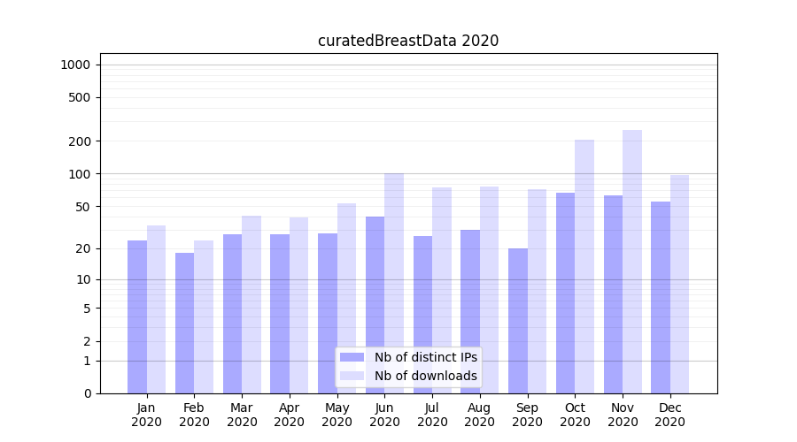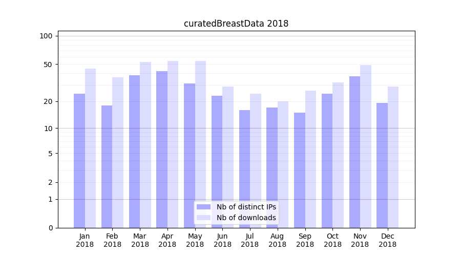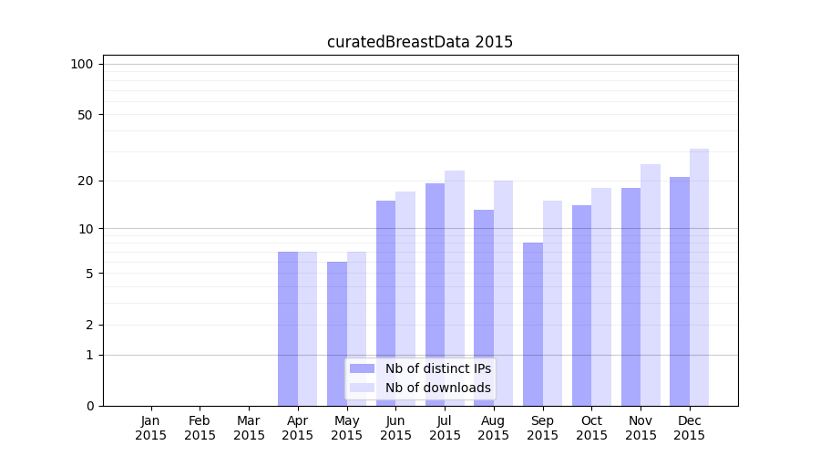 Number of downloads for experiment package curatedBreastData, year by year, from 2025 back to 2014 (years with no downloads are omitted):