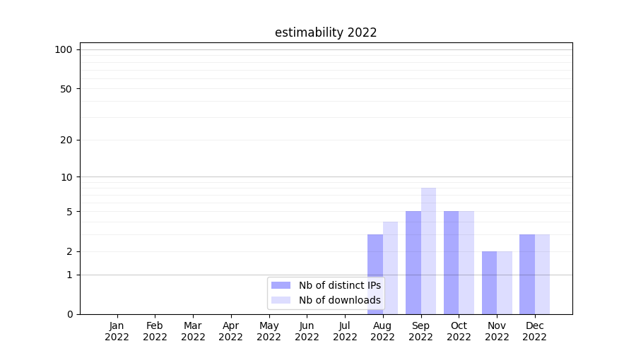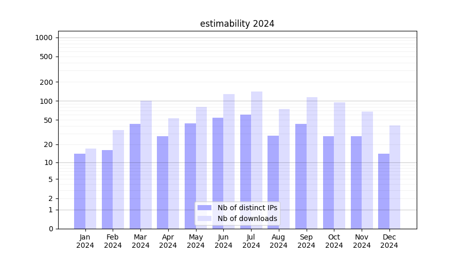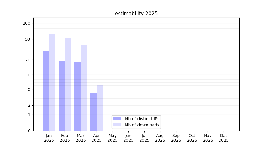Number of downloads for experiment package estimability, year by year, from 2025 back to 2014 (years with no downloads are omitted):