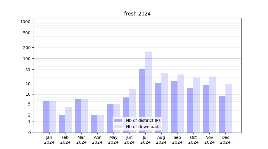 Number of downloads for experiment package fresh, year by year, from 2025 back to 2014 (years with no downloads are omitted):