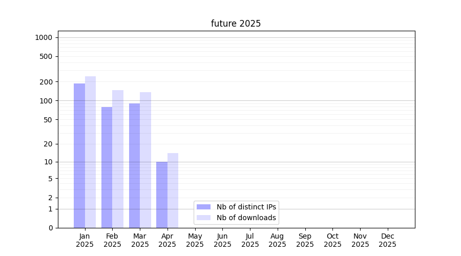 Number of downloads for experiment package future, year by year, from 2025 back to 2014 (years with no downloads are omitted):