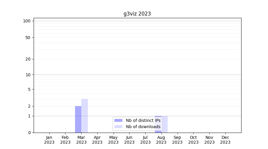Number of downloads for experiment package g3viz, year by year, from 2025 back to 2014 (years with no downloads are omitted):