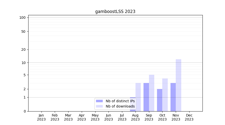 Number of downloads for experiment package gamboostLSS, year by year, from 2025 back to 2014 (years with no downloads are omitted):