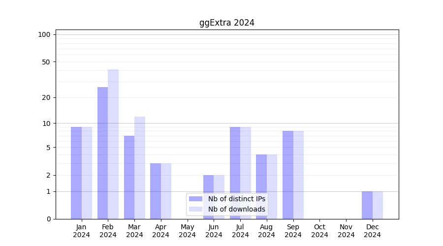 Number of downloads for experiment package ggExtra, year by year, from 2025 back to 2014 (years with no downloads are omitted):