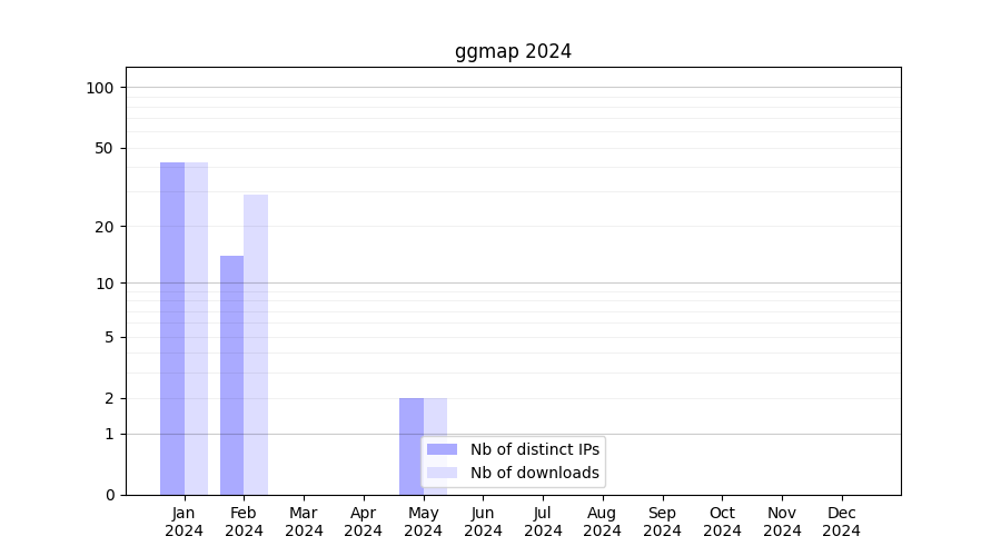 Number of downloads for experiment package ggmap, year by year, from 2025 back to 2014 (years with no downloads are omitted):
