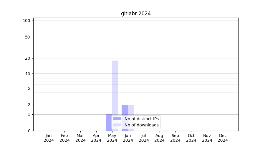 Number of downloads for experiment package gitlabr, year by year, from 2025 back to 2014 (years with no downloads are omitted):