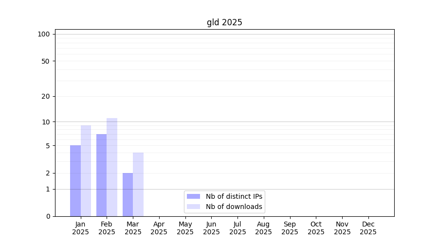 Number of downloads for experiment package gld, year by year, from 2025 back to 2014 (years with no downloads are omitted):