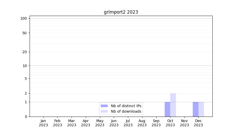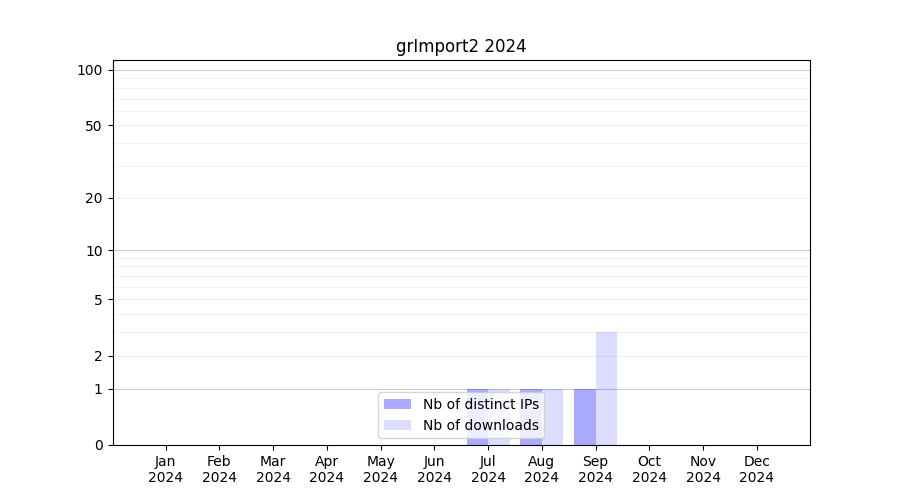 Number of downloads for experiment package grImport2, year by year, from 2025 back to 2014 (years with no downloads are omitted):