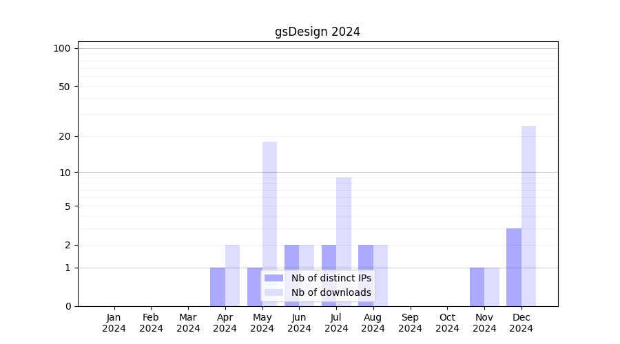 Number of downloads for experiment package gsDesign, year by year, from 2025 back to 2014 (years with no downloads are omitted):