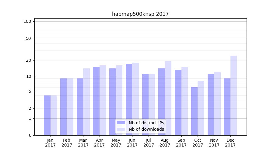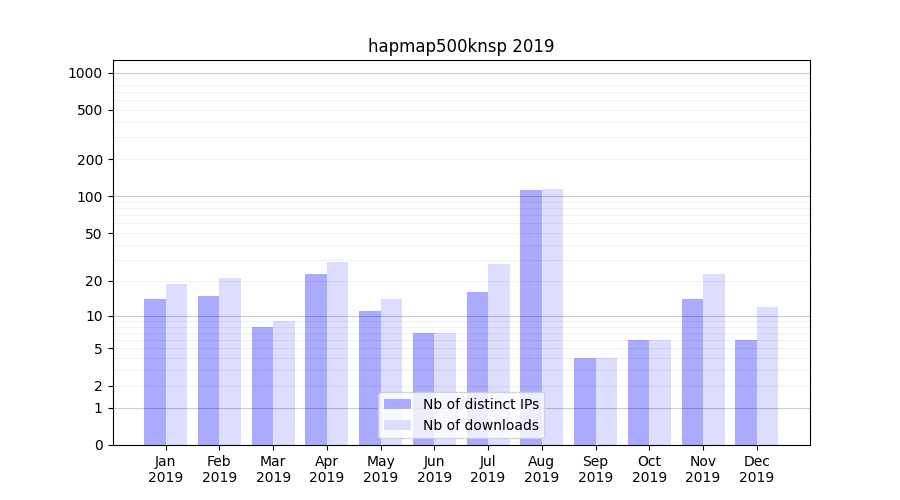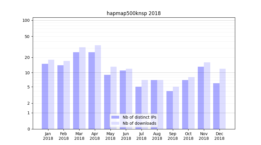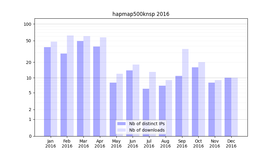 Number of downloads for experiment package hapmap500knsp, year by year, from 2025 back to 2014 (years with no downloads are omitted):