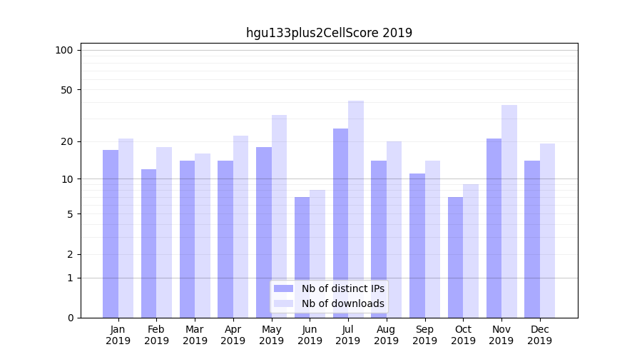 Number of downloads for experiment package hgu133plus2CellScore, year by year, from 2025 back to 2014 (years with no downloads are omitted):