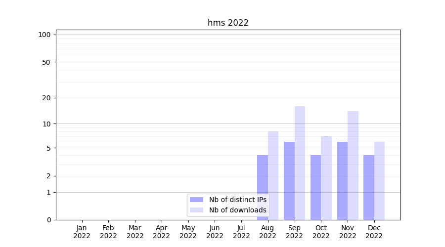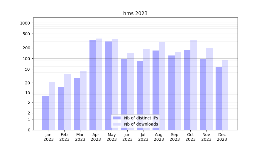 Number of downloads for experiment package hms, year by year, from 2025 back to 2014 (years with no downloads are omitted):