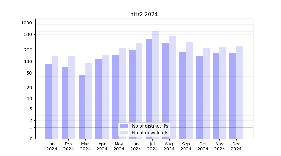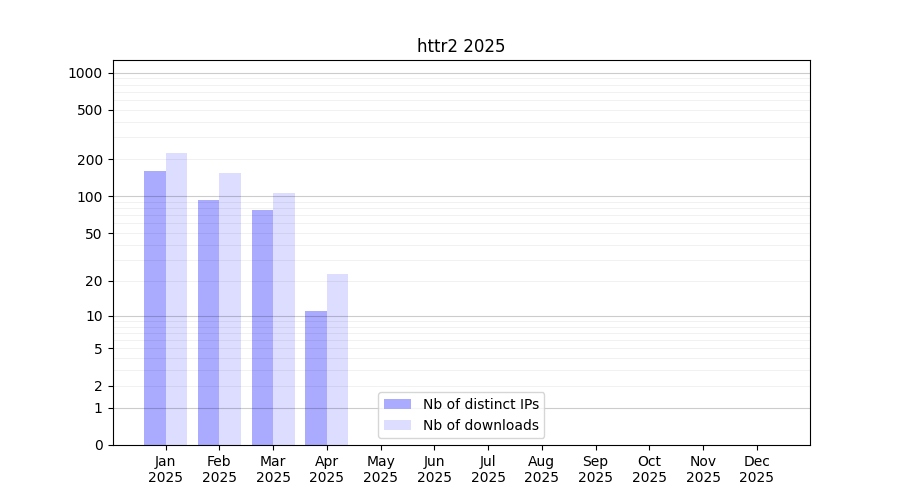 Number of downloads for experiment package httr2, year by year, from 2025 back to 2014 (years with no downloads are omitted):