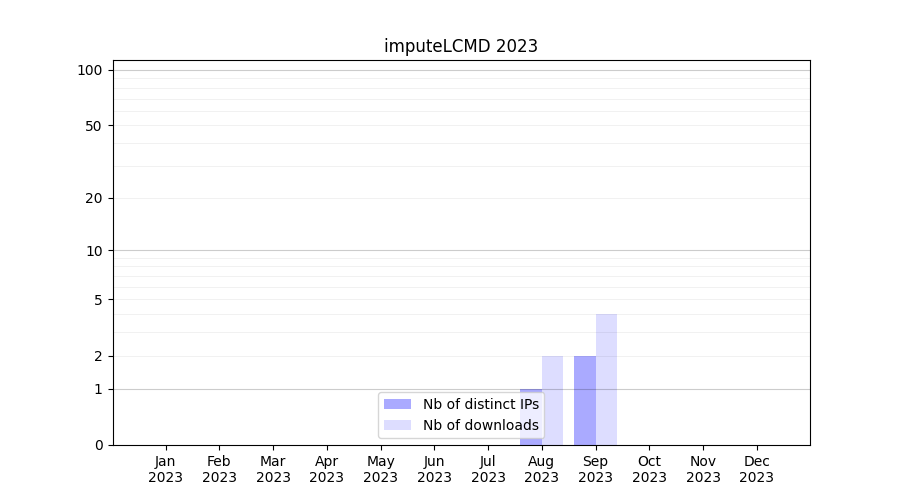 Number of downloads for experiment package imputeLCMD, year by year, from 2025 back to 2014 (years with no downloads are omitted):
