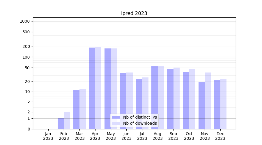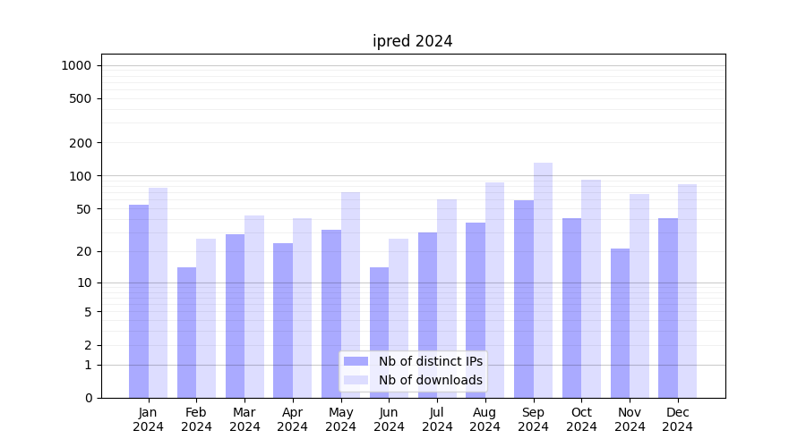 Number of downloads for experiment package ipred, year by year, from 2025 back to 2014 (years with no downloads are omitted):