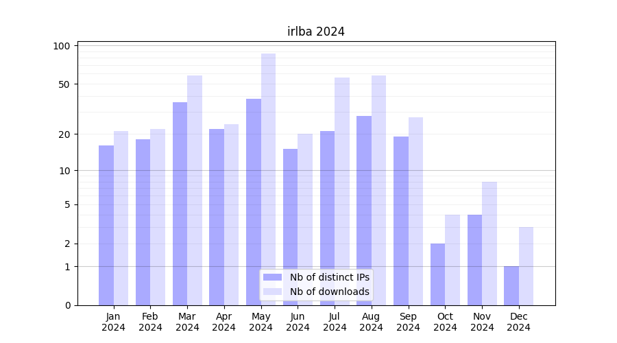 Number of downloads for experiment package irlba, year by year, from 2025 back to 2014 (years with no downloads are omitted):