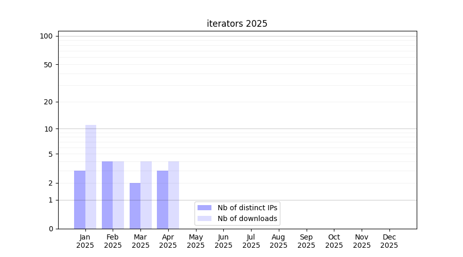 Number of downloads for experiment package iterators, year by year, from 2025 back to 2014 (years with no downloads are omitted):