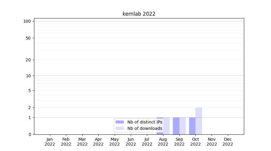 Number of downloads for experiment package kernlab, year by year, from 2025 back to 2014 (years with no downloads are omitted):