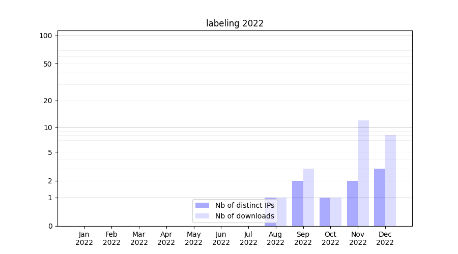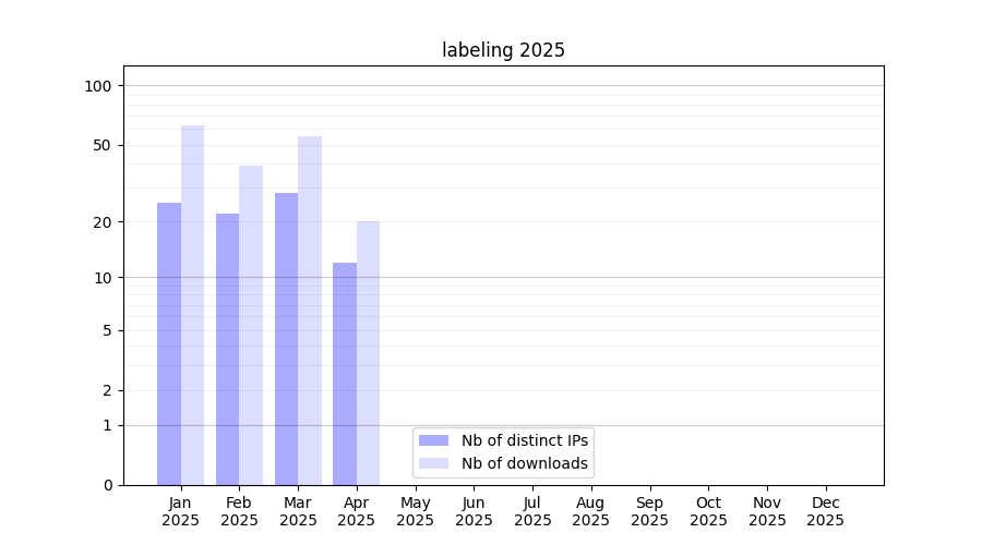 Number of downloads for experiment package labeling, year by year, from 2025 back to 2014 (years with no downloads are omitted):