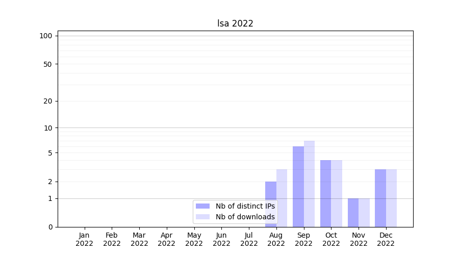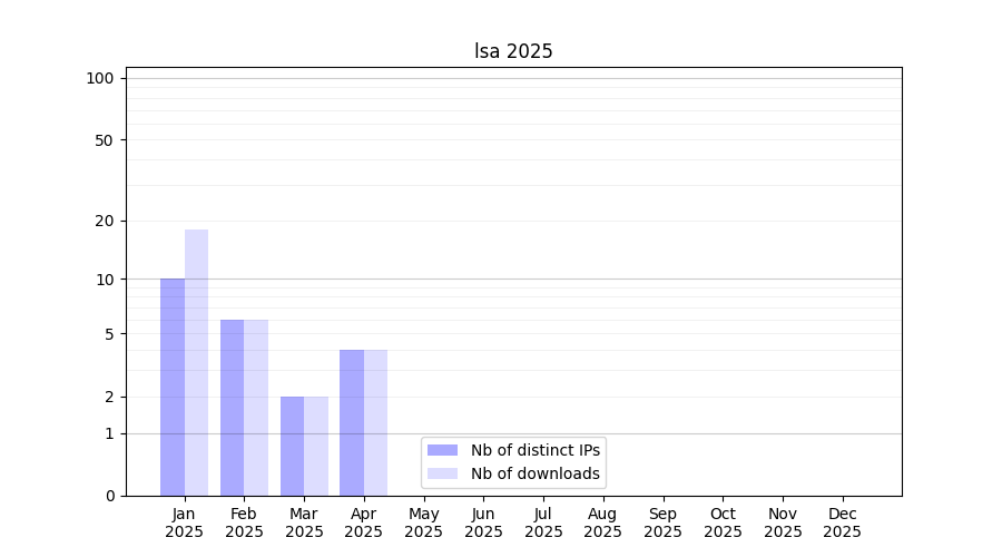 Number of downloads for experiment package lsa, year by year, from 2025 back to 2014 (years with no downloads are omitted):