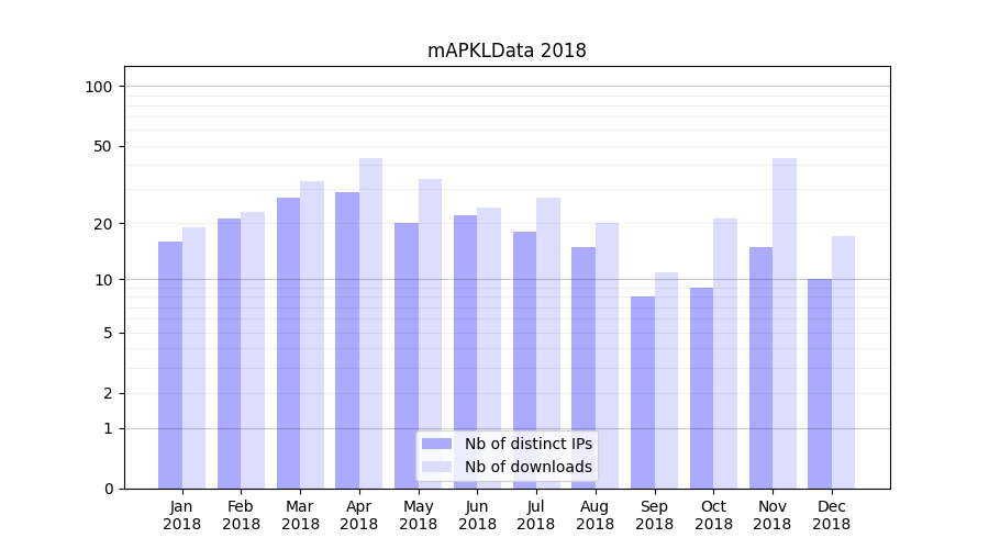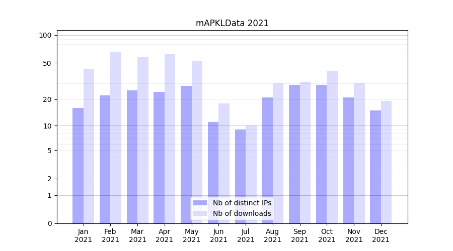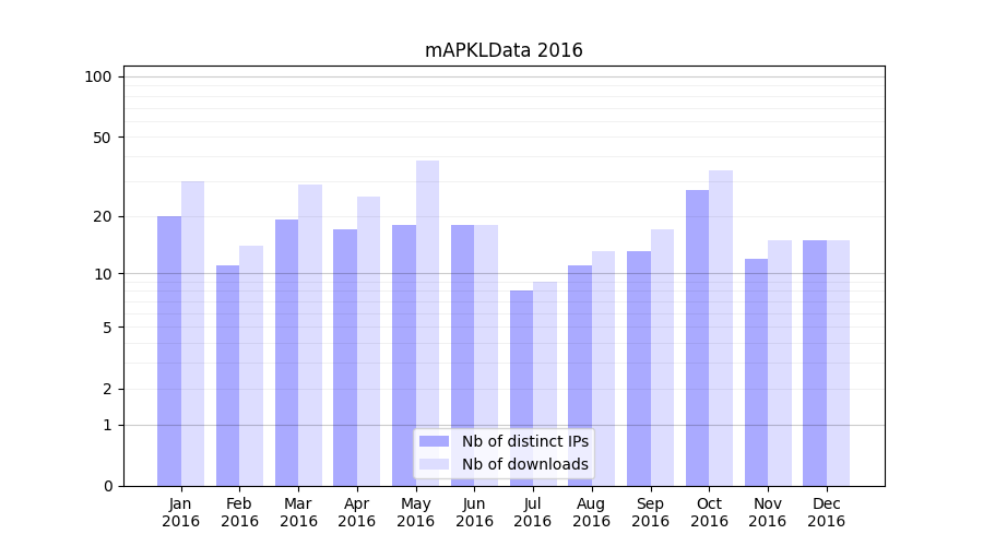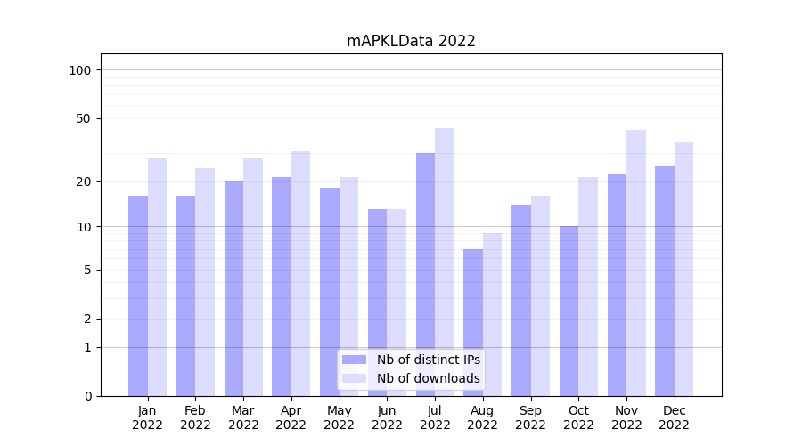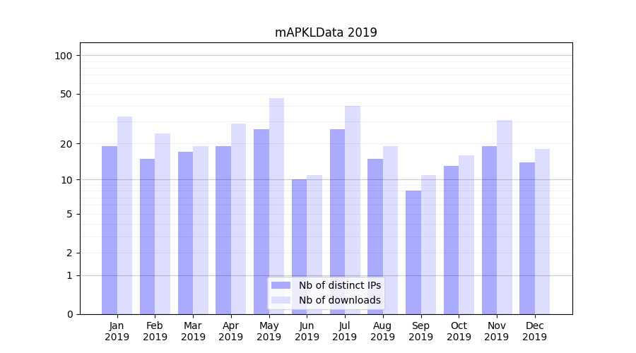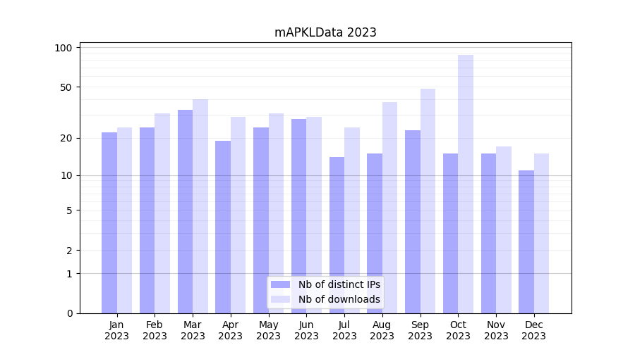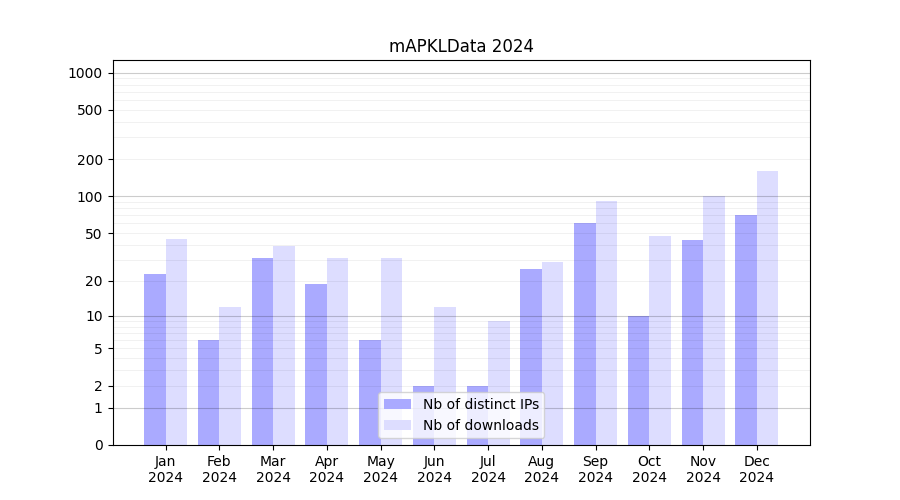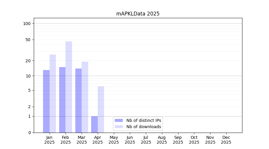 Number of downloads for experiment package mAPKLData, year by year, from 2025 back to 2014 (years with no downloads are omitted):