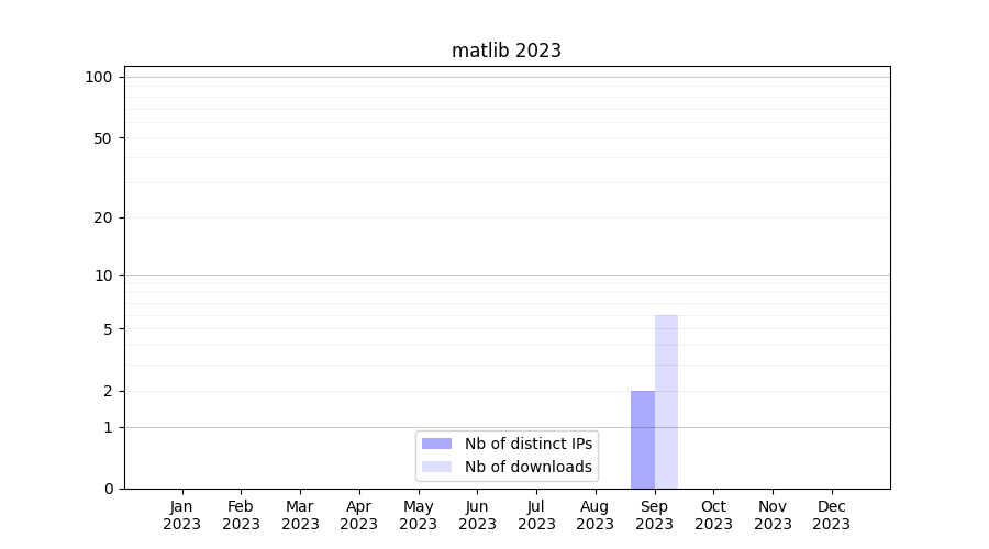 Number of downloads for experiment package matlib, year by year, from 2025 back to 2014 (years with no downloads are omitted):