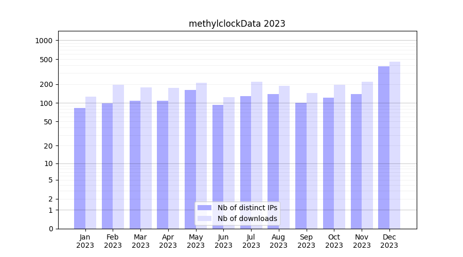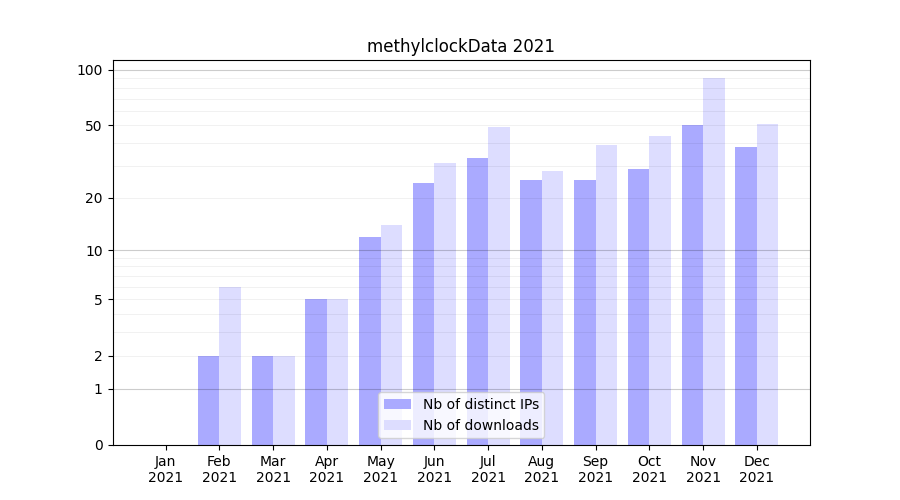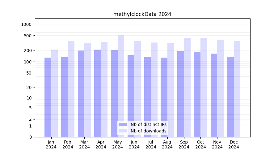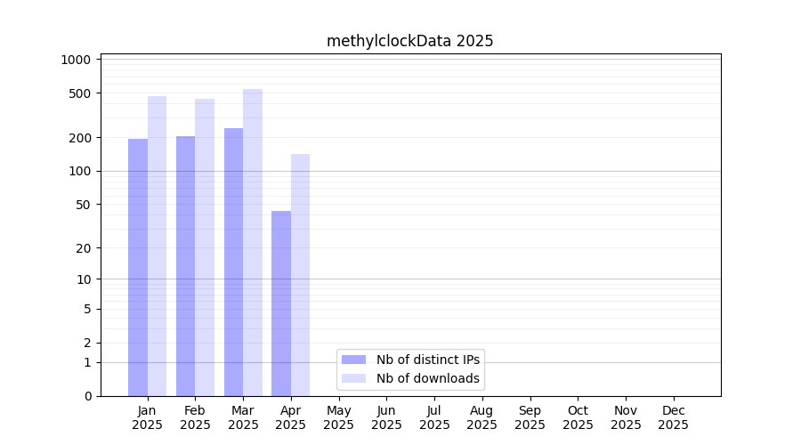Number of downloads for experiment package methylclockData, year by year, from 2025 back to 2014 (years with no downloads are omitted):