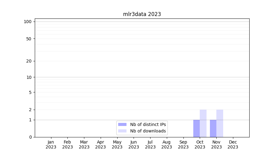 Number of downloads for experiment package mlr3data, year by year, from 2025 back to 2014 (years with no downloads are omitted):