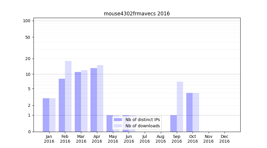 Number of downloads for experiment package mouse4302frmavecs, year by year, from 2025 back to 2014 (years with no downloads are omitted):