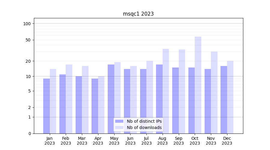 Number of downloads for experiment package msqc1, year by year, from 2025 back to 2014 (years with no downloads are omitted):