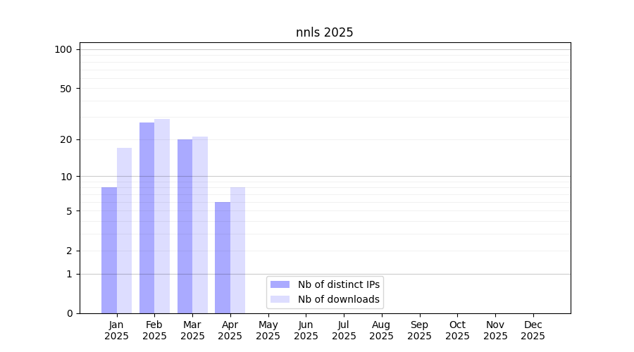 Number of downloads for experiment package nnls, year by year, from 2025 back to 2014 (years with no downloads are omitted):