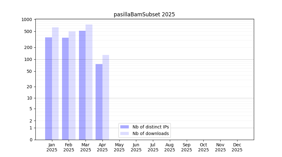 Number of downloads for experiment package pasillaBamSubset, year by year, from 2025 back to 2014 (years with no downloads are omitted):