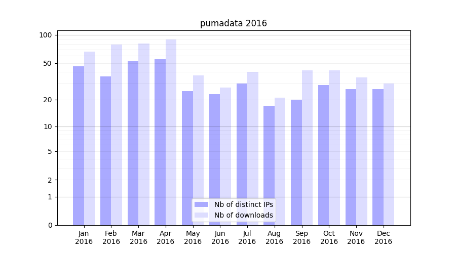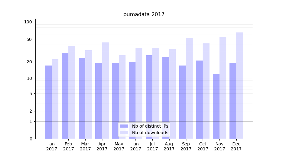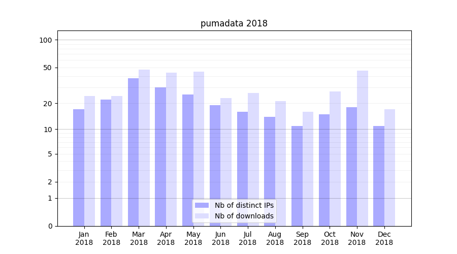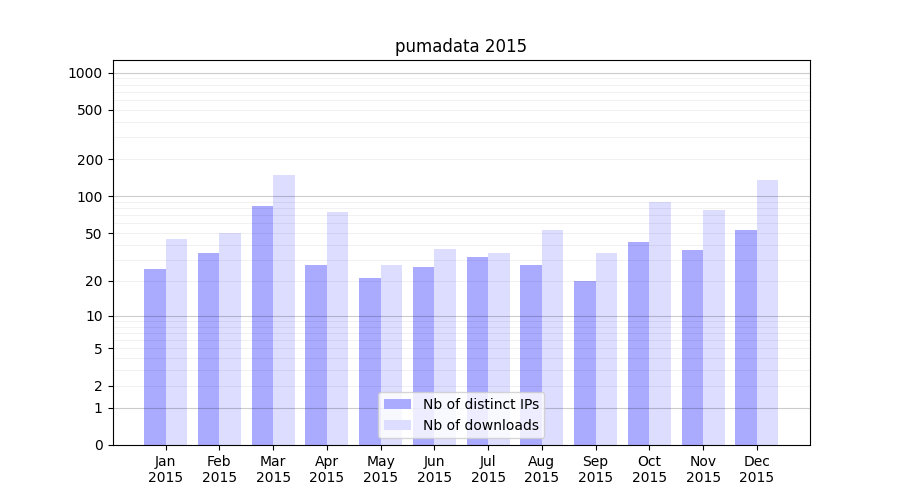 Number of downloads for experiment package pumadata, year by year, from 2025 back to 2014 (years with no downloads are omitted):