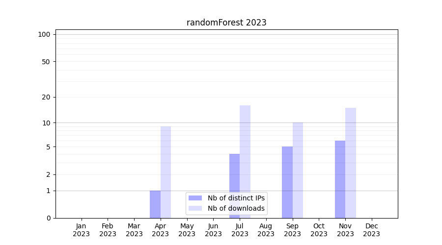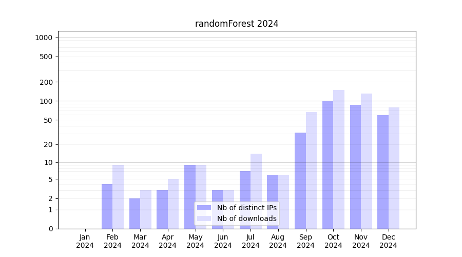 Number of downloads for experiment package randomForest, year by year, from 2025 back to 2014 (years with no downloads are omitted):