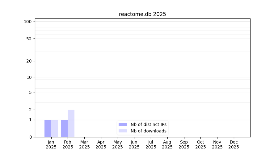 Number of downloads for experiment package reactome.db, year by year, from 2025 back to 2014 (years with no downloads are omitted):