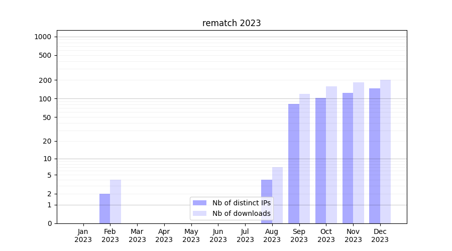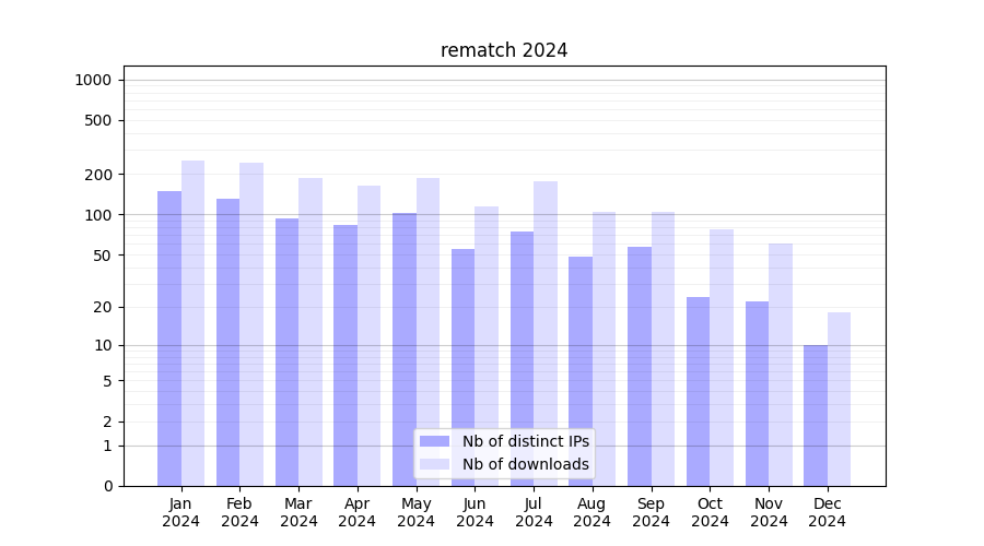 Number of downloads for experiment package rematch, year by year, from 2025 back to 2014 (years with no downloads are omitted):