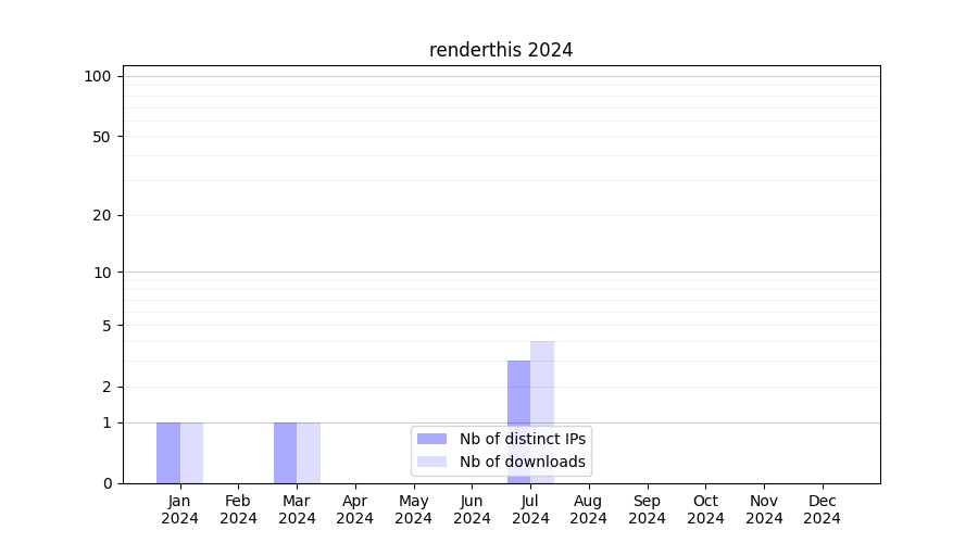 Number of downloads for experiment package renderthis, year by year, from 2025 back to 2014 (years with no downloads are omitted):