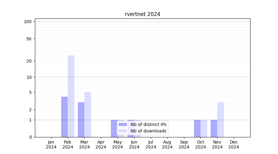 Number of downloads for experiment package rvertnet, year by year, from 2025 back to 2014 (years with no downloads are omitted):