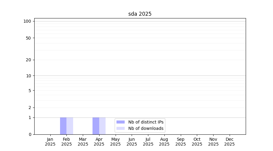Number of downloads for experiment package sda, year by year, from 2025 back to 2014 (years with no downloads are omitted):