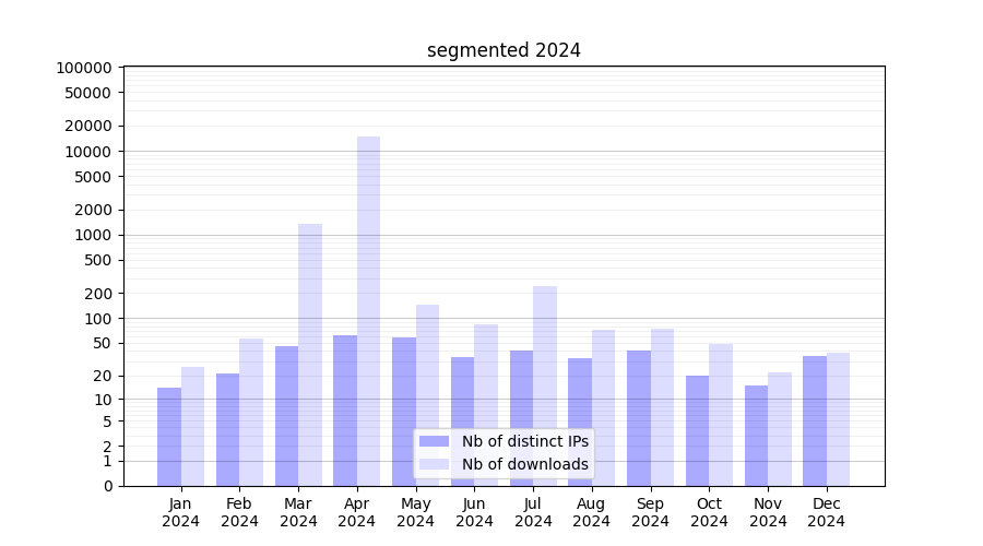 Number of downloads for experiment package segmented, year by year, from 2025 back to 2014 (years with no downloads are omitted):