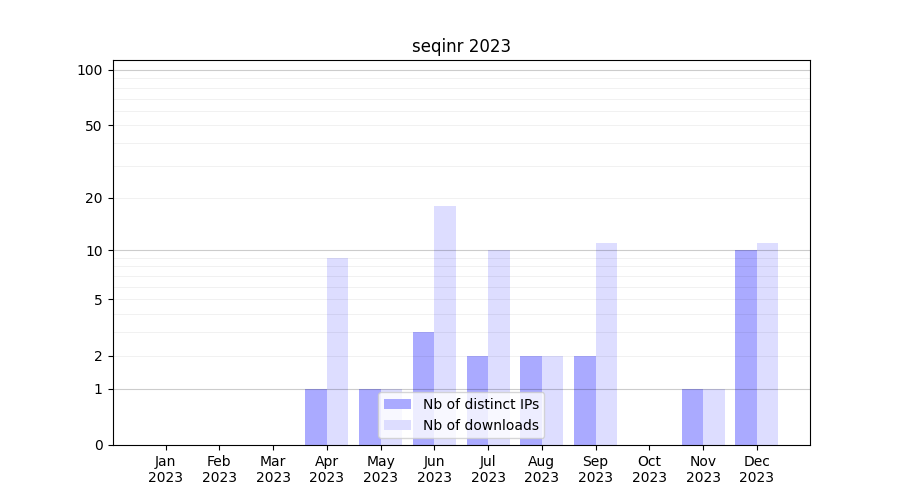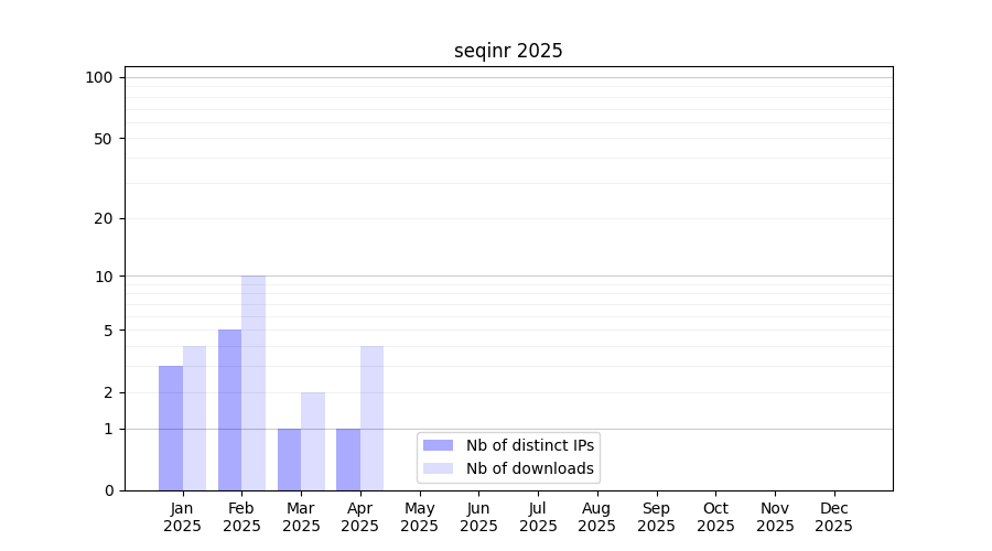 Number of downloads for experiment package seqinr, year by year, from 2025 back to 2014 (years with no downloads are omitted):