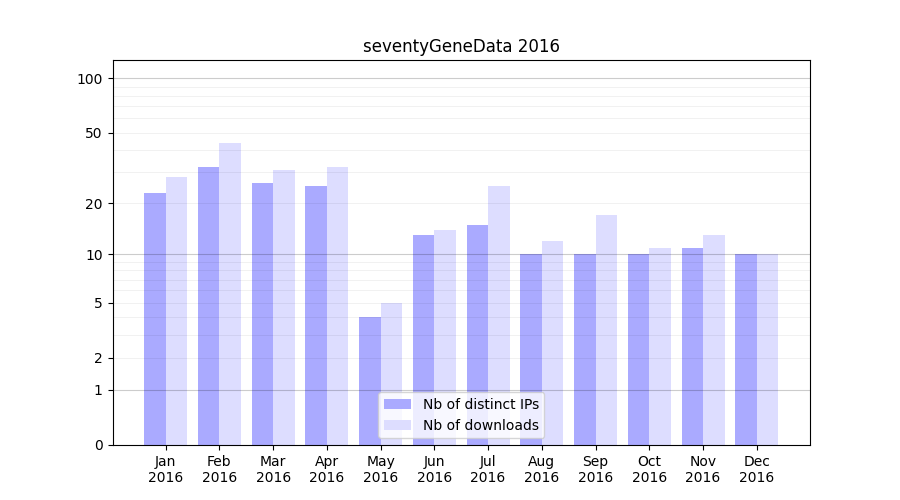 Number of downloads for experiment package seventyGeneData, year by year, from 2025 back to 2014 (years with no downloads are omitted):
