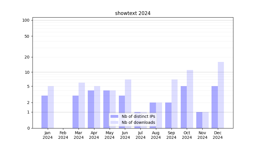 Number of downloads for experiment package showtext, year by year, from 2025 back to 2014 (years with no downloads are omitted):
