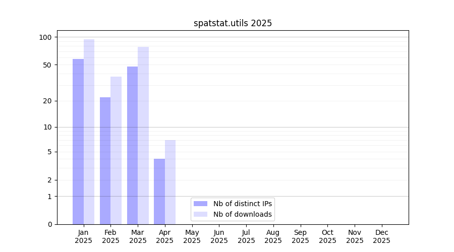 Number of downloads for experiment package spatstat.utils, year by year, from 2025 back to 2014 (years with no downloads are omitted):