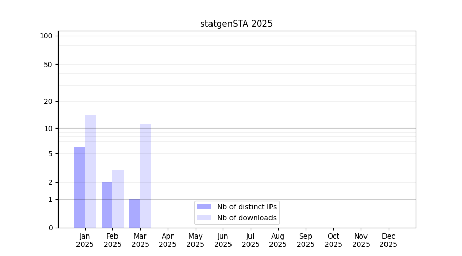 Number of downloads for experiment package statgenSTA, year by year, from 2025 back to 2014 (years with no downloads are omitted):