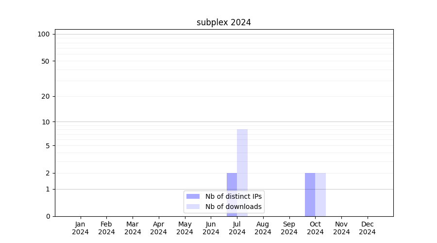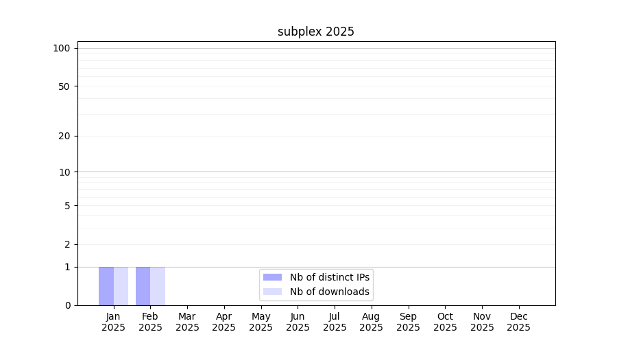 Number of downloads for experiment package subplex, year by year, from 2025 back to 2014 (years with no downloads are omitted):