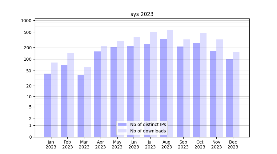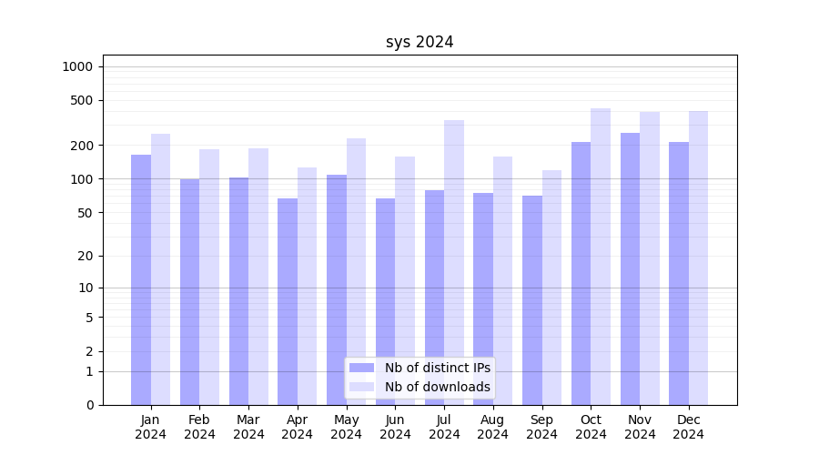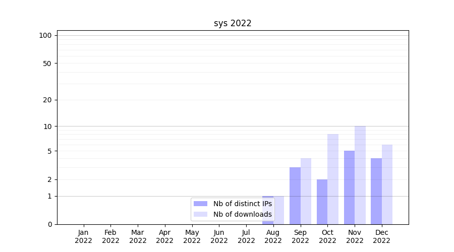 Number of downloads for experiment package sys, year by year, from 2025 back to 2014 (years with no downloads are omitted):