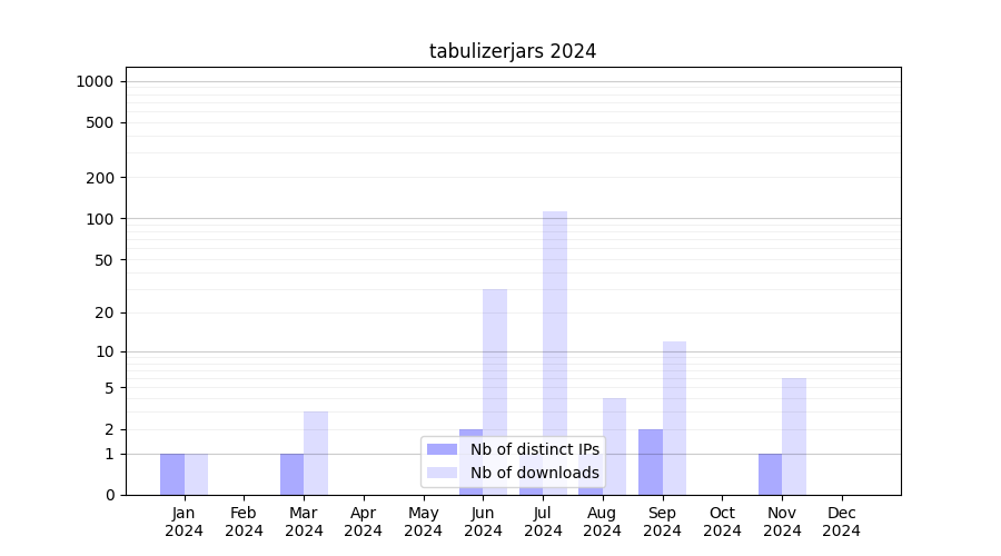 Number of downloads for experiment package tabulizerjars, year by year, from 2025 back to 2014 (years with no downloads are omitted):